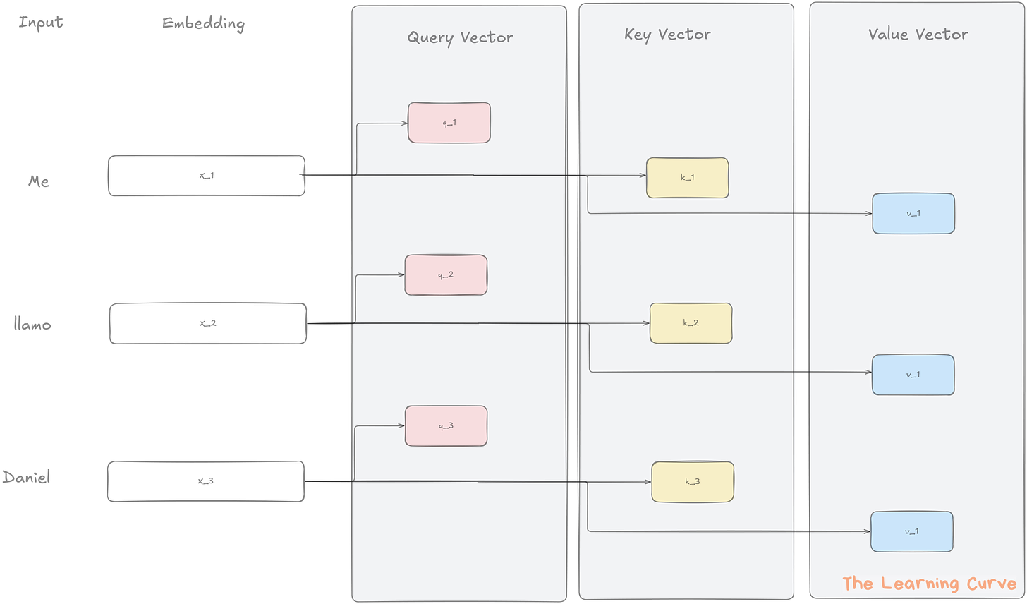 Para cada palabra (token) en la secuencia, el modelo genera tres vectores: