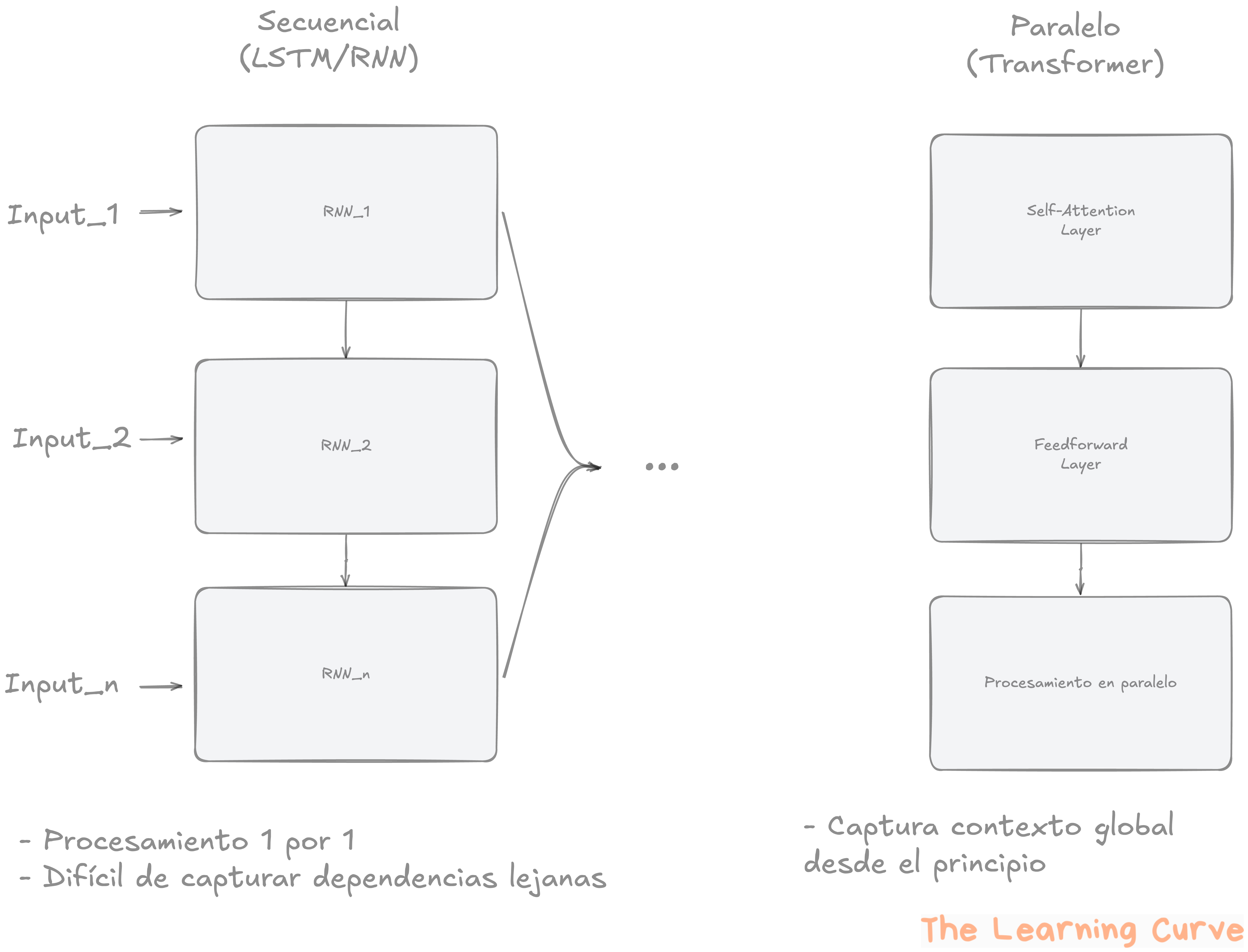 Además, el procesamiento secuencial impedía aprovechar el paralelismo de los GPUs. Había que esperar a procesar la palabra anterior antes de continuar, lo que ralentizaba el entrenamiento y la inferencia.